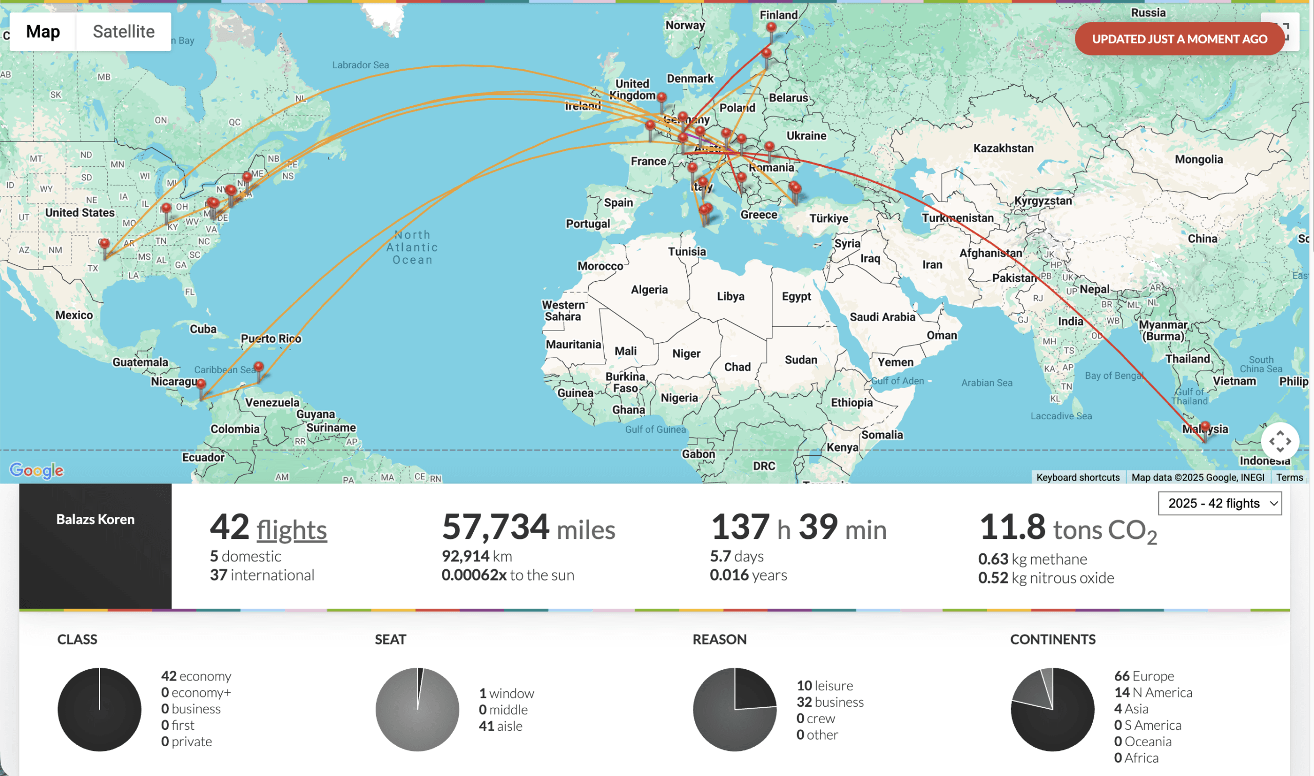A fenti képen látható, hogy majdnem 6 napot töltöttem 2025-ben a levegőben. Ez nagyon sok… 3 kontinens (4, ha Közép-Amerika külön számít), 14 ország.